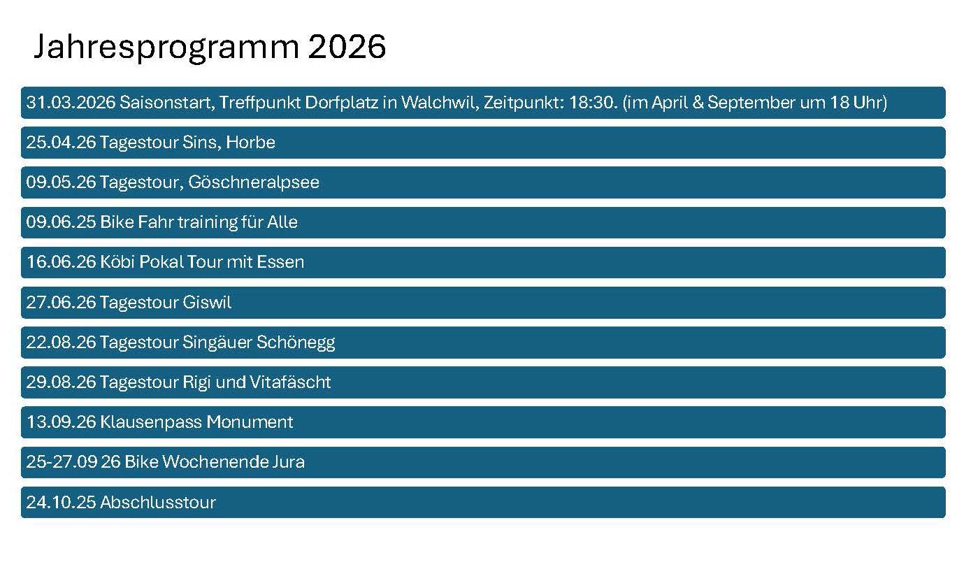 Der Bike Club Walchwil trifft sich jeden Dienstag um 18:00 Uhr auf dem Dorfplatz, von wo aus gestartet wird (ab Mai starten wir um 18:30 Uhr).